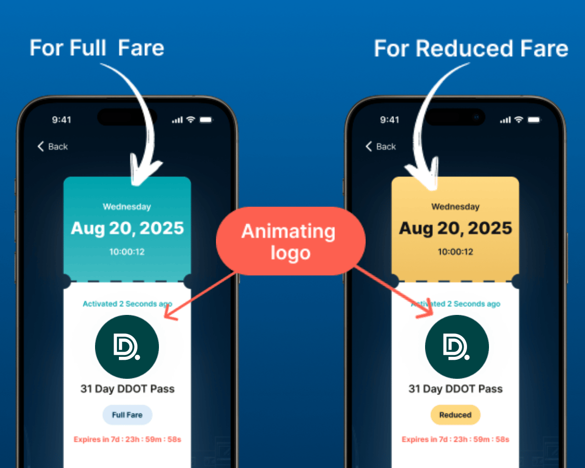 MyRide Wallet passes will feature animation of the DDOT logo to prevent fraudulent use of screenshots. Confirm that the pass that the rider is showing you, the DDOT logo is pulsating..
